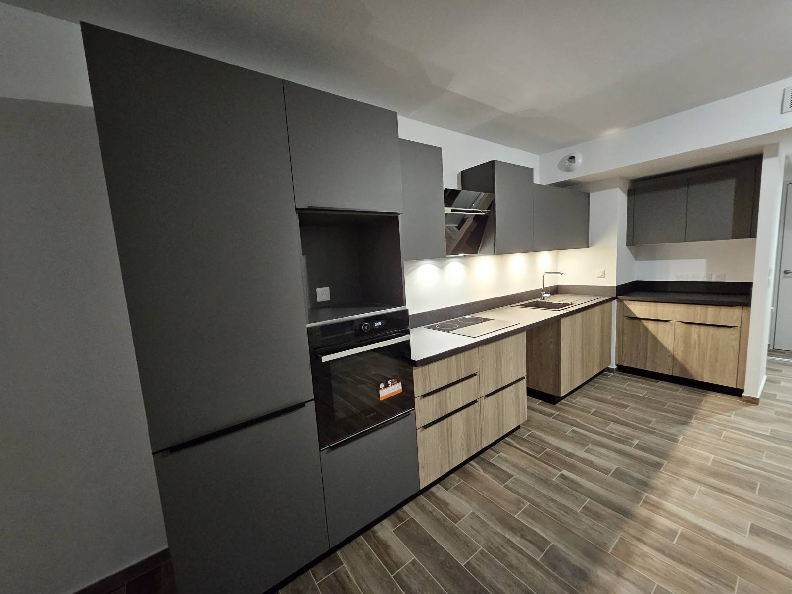 L'optimisation de l'espace est au cœur de notre démarche de conception. Dotée de nombreux rangements, d'un mur de colonnes abritant astucieusement four, micro-ondes et réfrigérateur, cette cuisine offre ainsi une fonctionnalité optimale sans compromettre l'esthétique générale.
