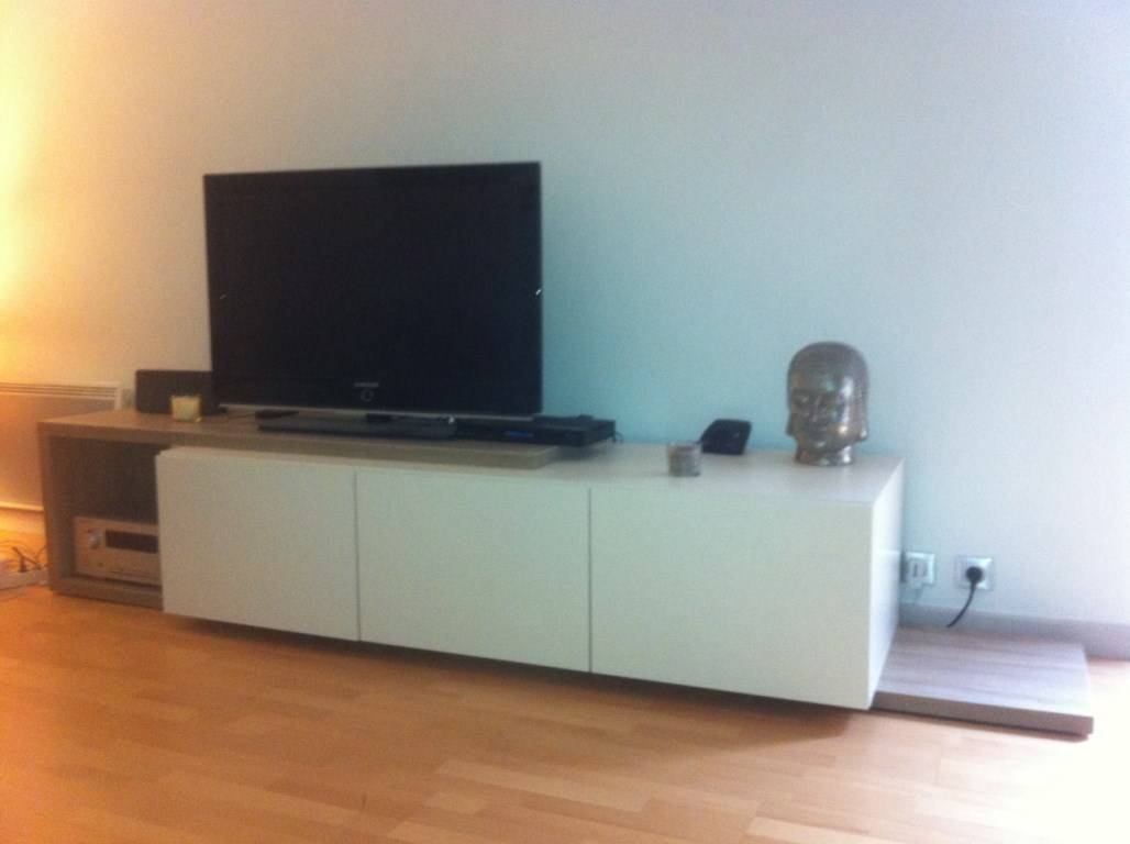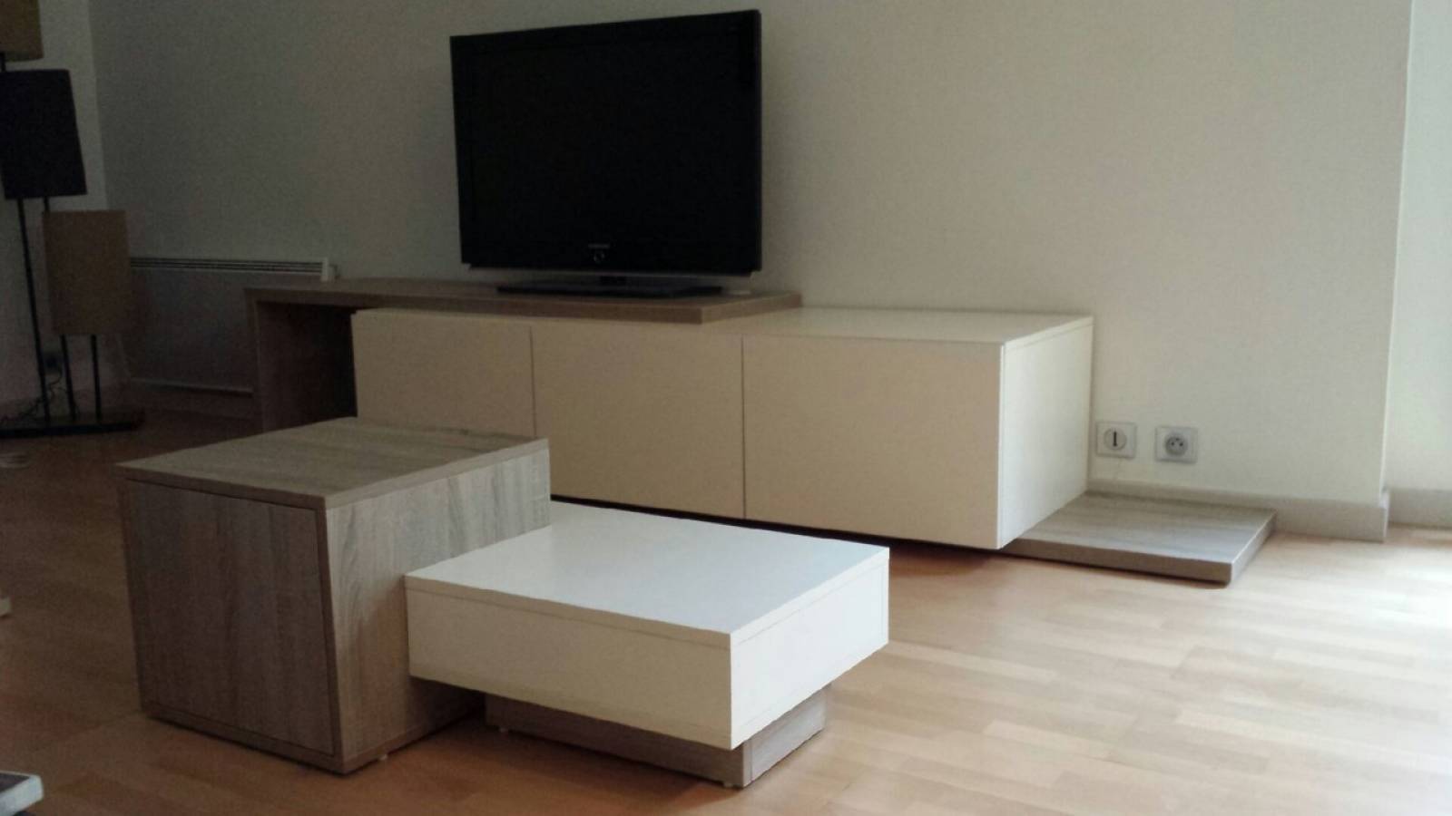 Ce meuble TVa été réalisé en panneau décor d'épaisseur de 38 mm et 19 mm sans fixation murale, selon le souhait du client qui désirait pouvoir le changer de place à sa guise (réalisé et monté d'usine pour qu'il soit entièrement mobile).