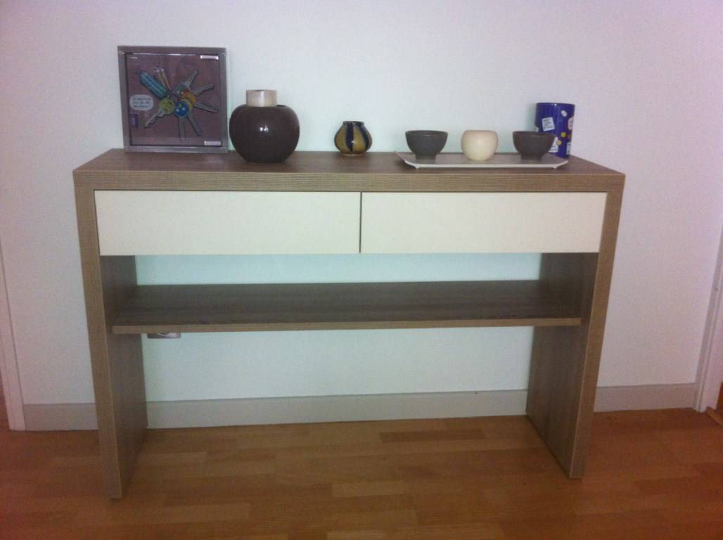 Il peut être assimilé à du "mobilier sur mesure" tout comme la console d'entrée qui estconstituée simplement de deux tiroirs pouss-lâch'(une seule pression suffit à l'ouverture de vos portes et une seconde pression est nécessaire pour les refermer) et d'une table basse.