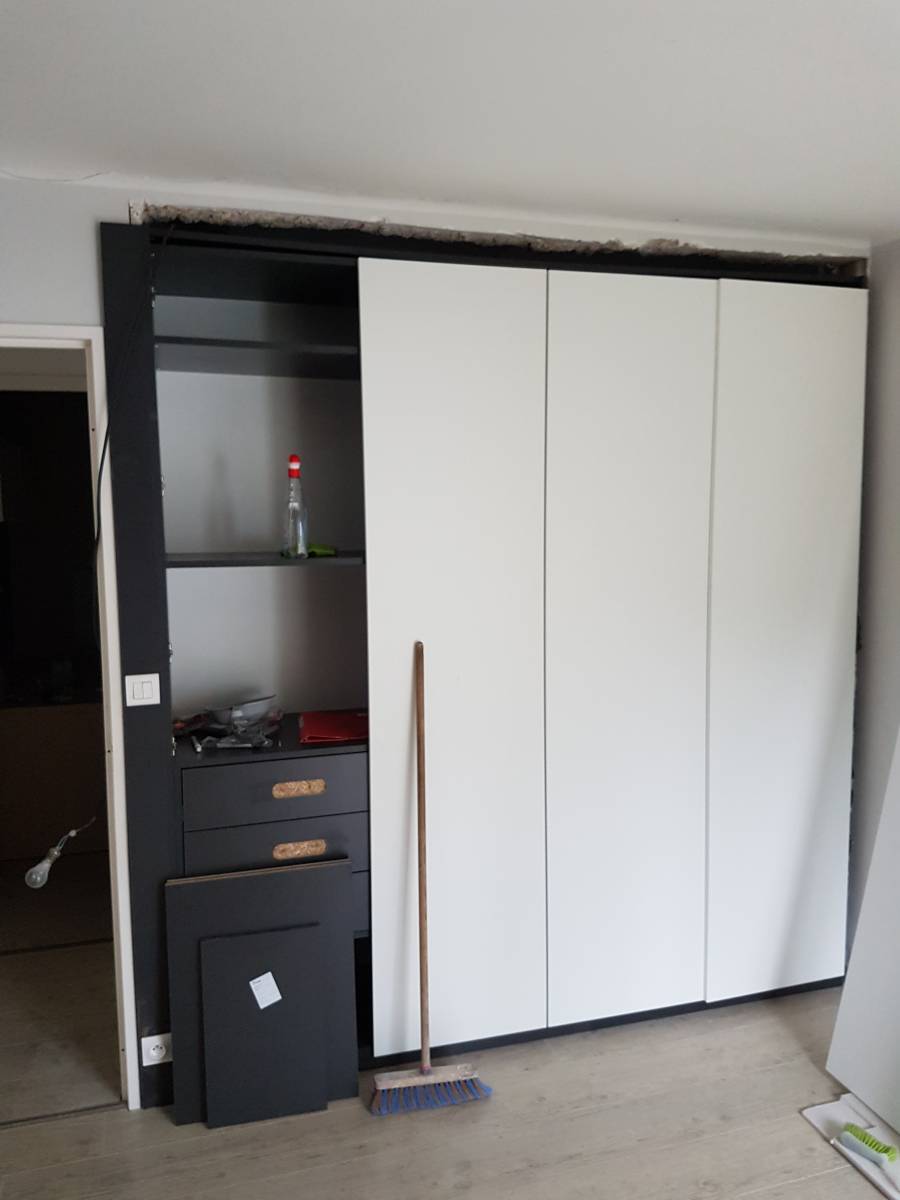 Notre équipe a transformé l'espace en rhabillant intégralement le pan de murs, du sol au plafond, y compris au-dessus du passage de porte. Une attention minutieuse a été portée à chaque détail, garantissant une intégration harmonieuse du rangement dans l'environnement existant.