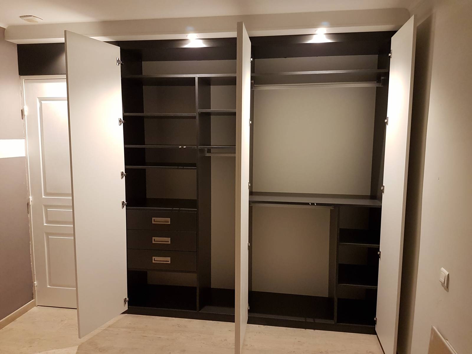 Pour optimiser l'éclairage, nous avons ajouté une avancée de 200 mm sur le toit du rangement sur mesure. Cette modification a permis l'installation de plusieurs spots LED orientables, assurant un éclairage optimal du placard tout en offrant une luminosité bienvenue à la chambre elle-même. L'alliance de fonctionnalité et d'esthétisme a été notre priorité, et le résultat final est véritablement saisissant, surtout en comparaison avec l'état initial de la pièce au début du chantier.