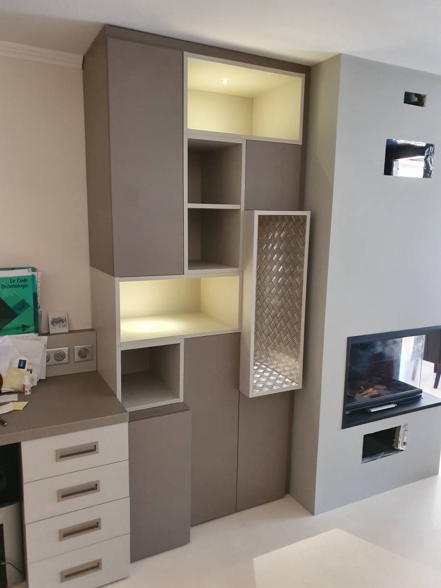 Rangement diversifié : Les niches fermées sont spécialement conçues pour accueillir des dossiers d'archivage, créant une extension naturelle du bureau précédemment réalisé par notre équipe. Pour une intégration harmonieuse, la cliente a souhaité la jonction avec sa cheminée d'angle.