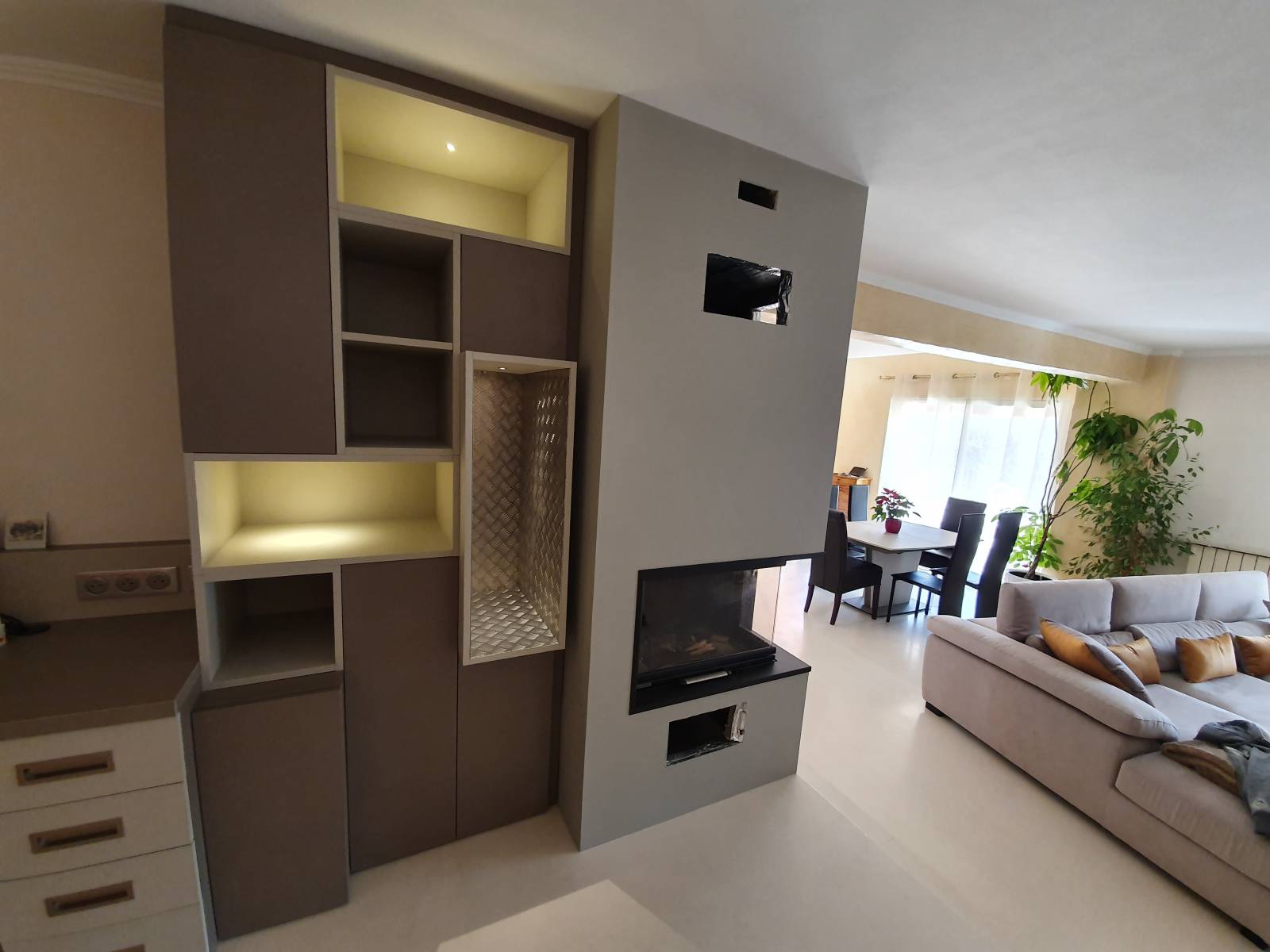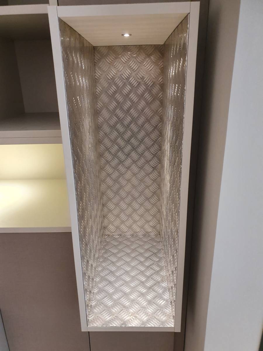 Aspect décoratif : Les niches ouvertes et éclairées sont dédiées à la décoration. Nous avons choisi d'incorporer de véritables bûches de bois dans une niche prévue à cet effet, protégée par des habillages en aluminium. Des niches plus étroites ont également été intégrées pour accueillir des objets de décoration.