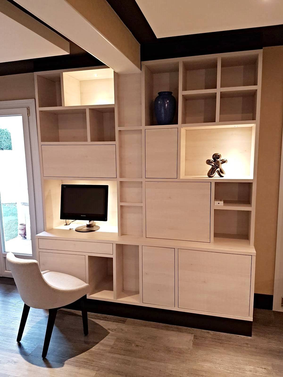 Elle est composée de plusieurs niches fermées par des portes de facade équipées du système pousse-lâche (une seule pression suffit à l'ouverture de vos portes et une seconde pression est nécessaire pour les refermer) ainsi qu'un tiroir dissimulant le clavier dans la partie bureau. Dans cette même partie, l'imprimante et la tour centrale de l'ordinateur sont dissimulés derrière les niches fermées, ainsi pour faciliter le câblage les prises de courants ont été plaquées sur le fond du meuble.