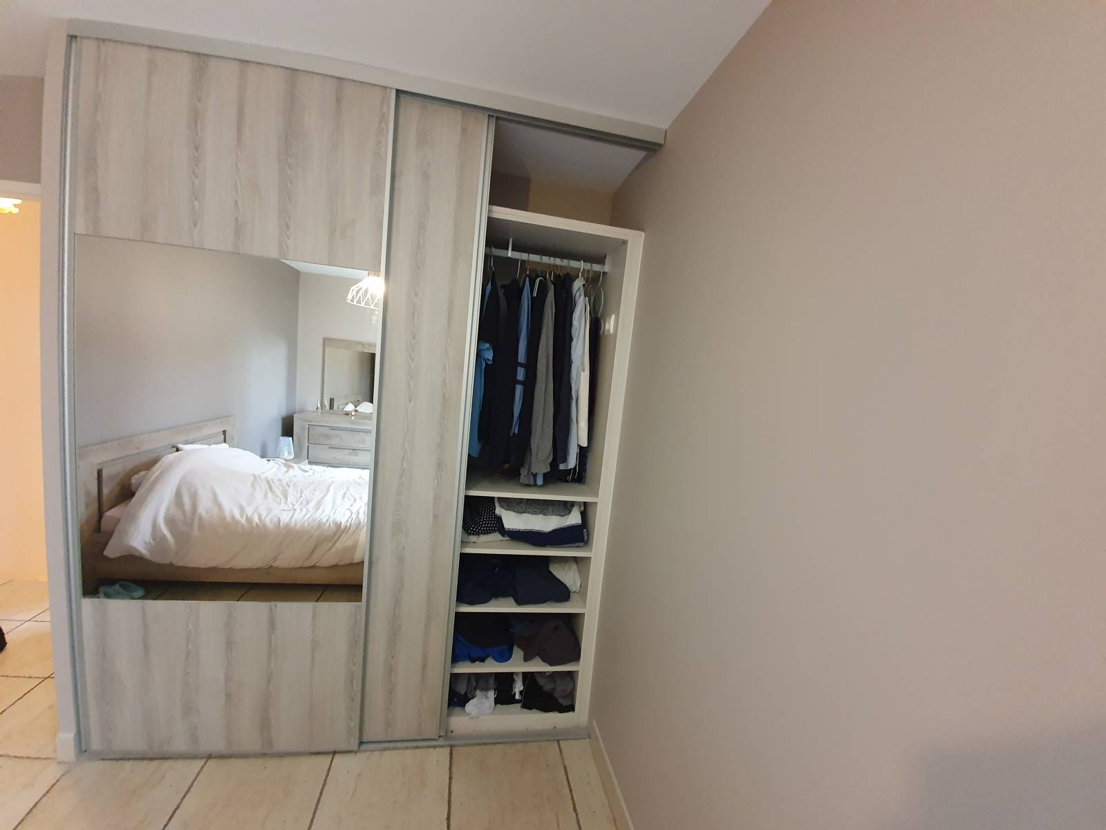 Les façades coulissantes en composition avec un demi miroir central sans traverses de séparation (bords polis sur bords polis) se déclinent en autant de combinaisons que vous pouvez avoir d'idées :