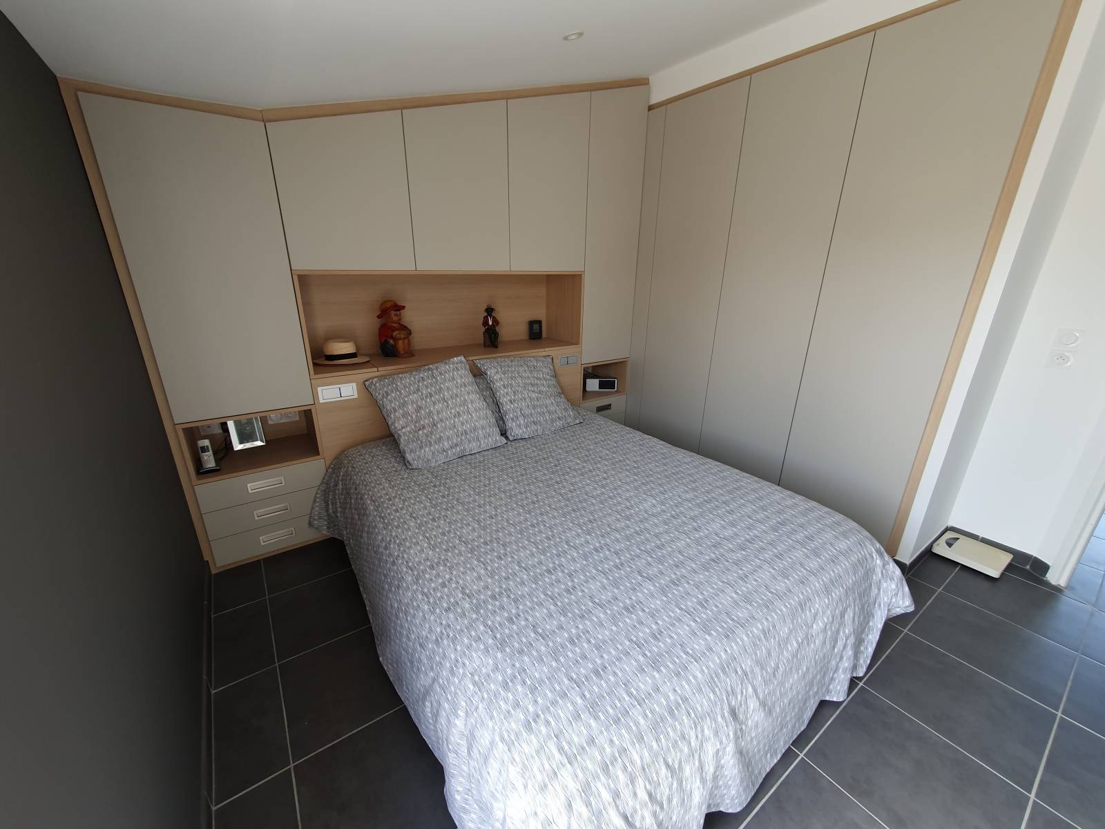 Cet agencement sur mesure à Carro se distingue par son décor en Chêne Vicenza naturel, avec des portes et une façade de tiroir de couleur Cachemire. Le placard suit harmonieusement la soupente de la chambre, offrant un espace de rangement astucieux derrière la tête de lit, avec un système de coffre dédié à loger la couette pendant la période estivale.