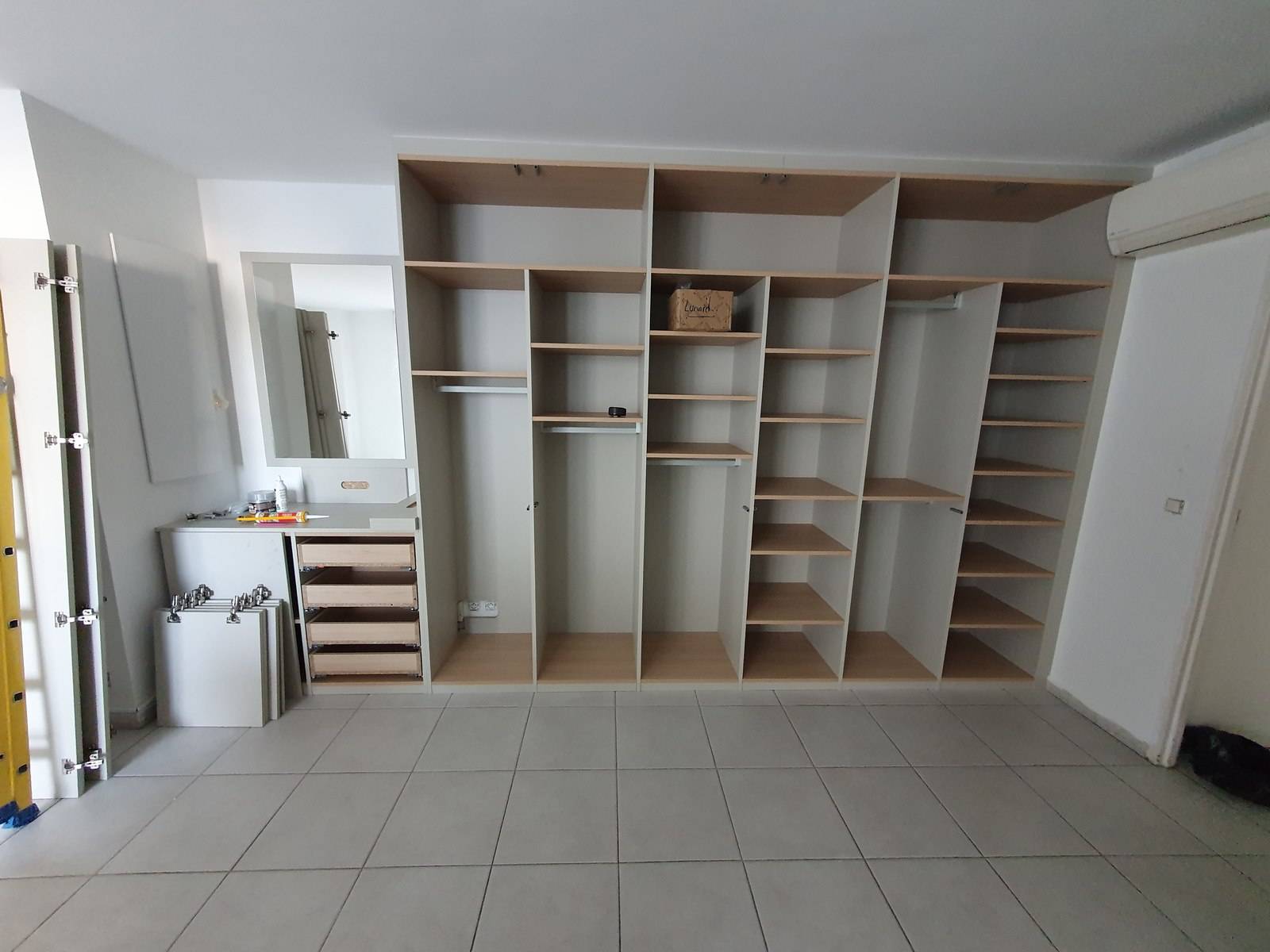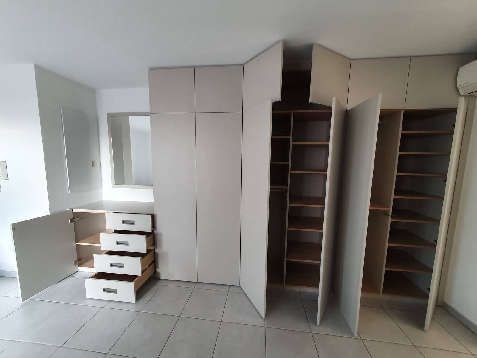 Ce rangement sur mesure, intégré dans un séjour marseillais, présente une conception singulière en raison de plusieurs contraintes, notamment le positionnement de la climatisation, l'accès au compteur électrique,et les arrivées électriques avec la fibre optique.