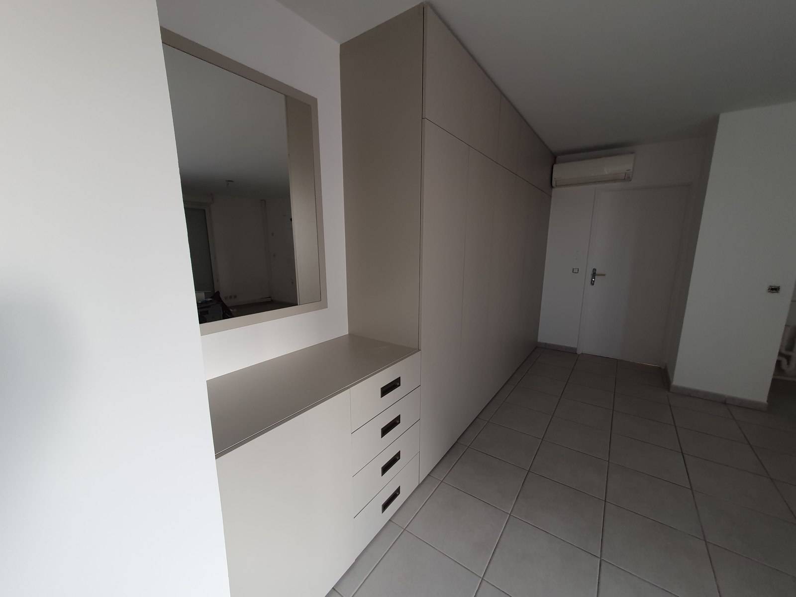 Du côté gauche, un meuble bas a été privilégié, offrant une accessibilité totale à la porte du compteur électrique et fonctionnant également comme console d'entrée. L'ajout d'un miroir fixé sur un panneau décor assorti aux portes crée un encadrement esthétique, rehaussant l'ensemble de manière harmonieuse.