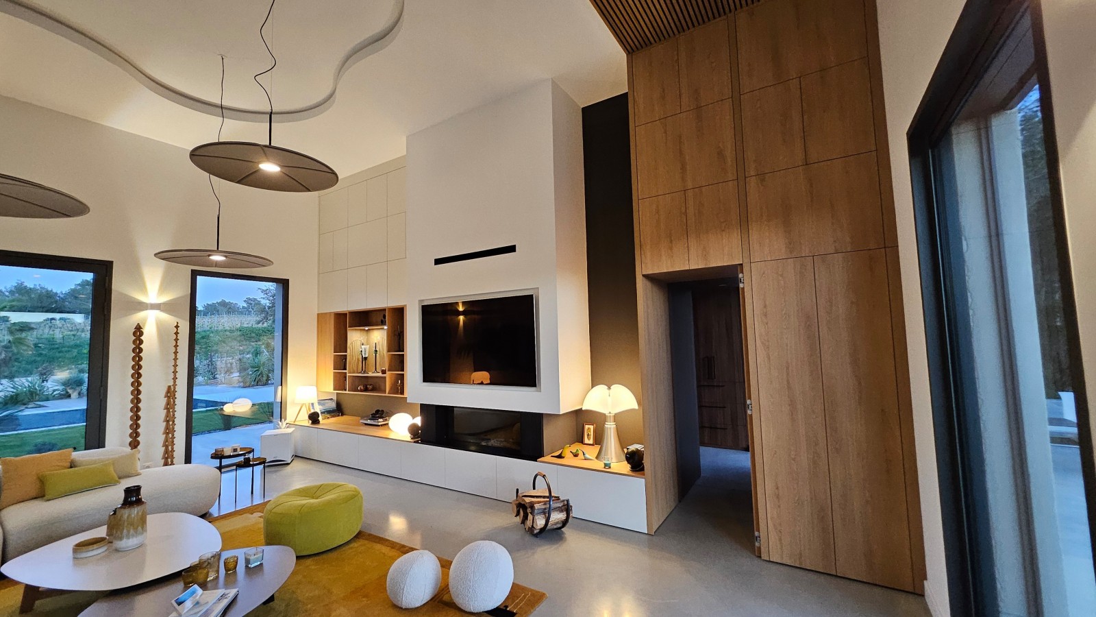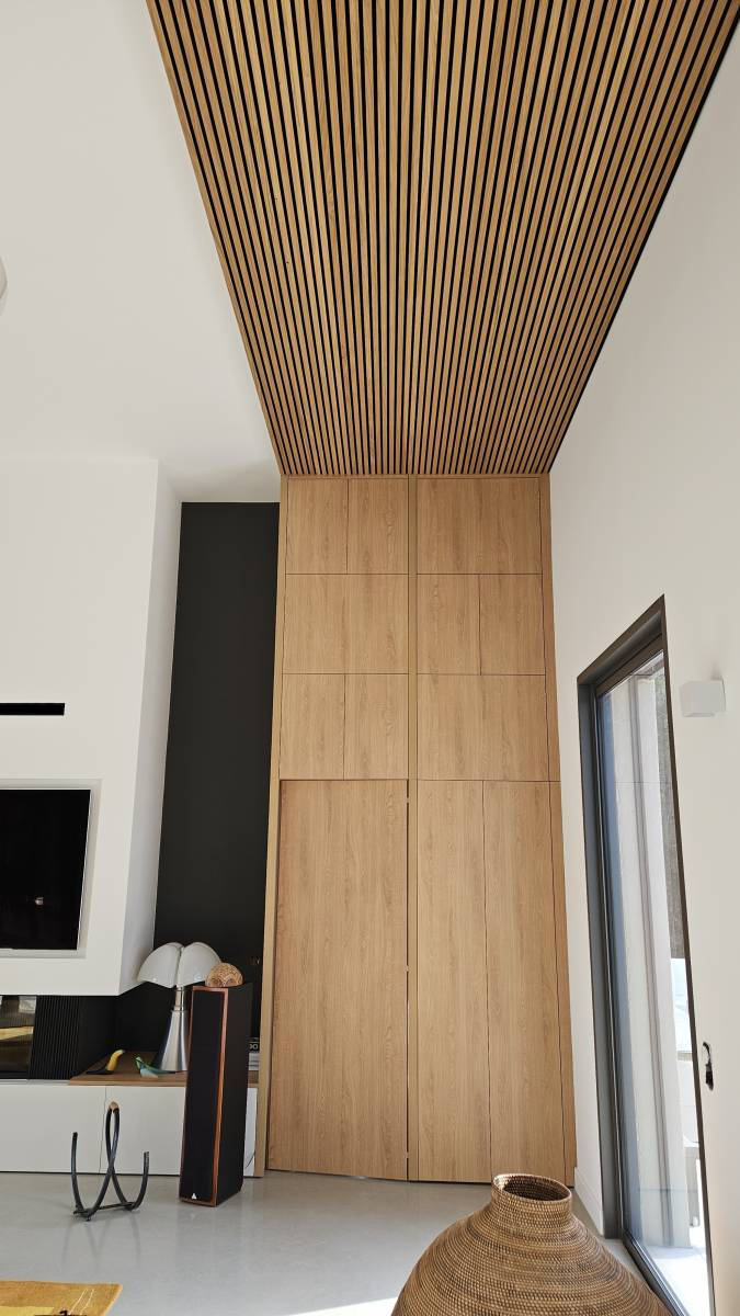 Un meuble TV : les éléments hauts et bas en décor porcelaine, dissimulent des rangements discrets et variés avec un système d'ouverture par pouss lach (simple pression), offrant ainsi un généreux espace de stockage. Le module central ouvert, réalisé en placage chêne corbrige, apporte une note chaleureuse et raffinée à l'ensemble. L'intégration astucieuse de la TV dans l'espace cheminée témoigne de notre approche novatrice. Un placard tout en élégance : Entièrement conçu en chêne corbrige, cet agencement rappelle le motif décoratif central du meuble TV, combinant rangements polyvalents et accès discret à l'espace nuit grâce à une porte dissimulée dotée d'un verrouillage magnétique. Le tout est sublimé par un habillage du faux plafond en bardage bois (chêne huilé sur fond noir).