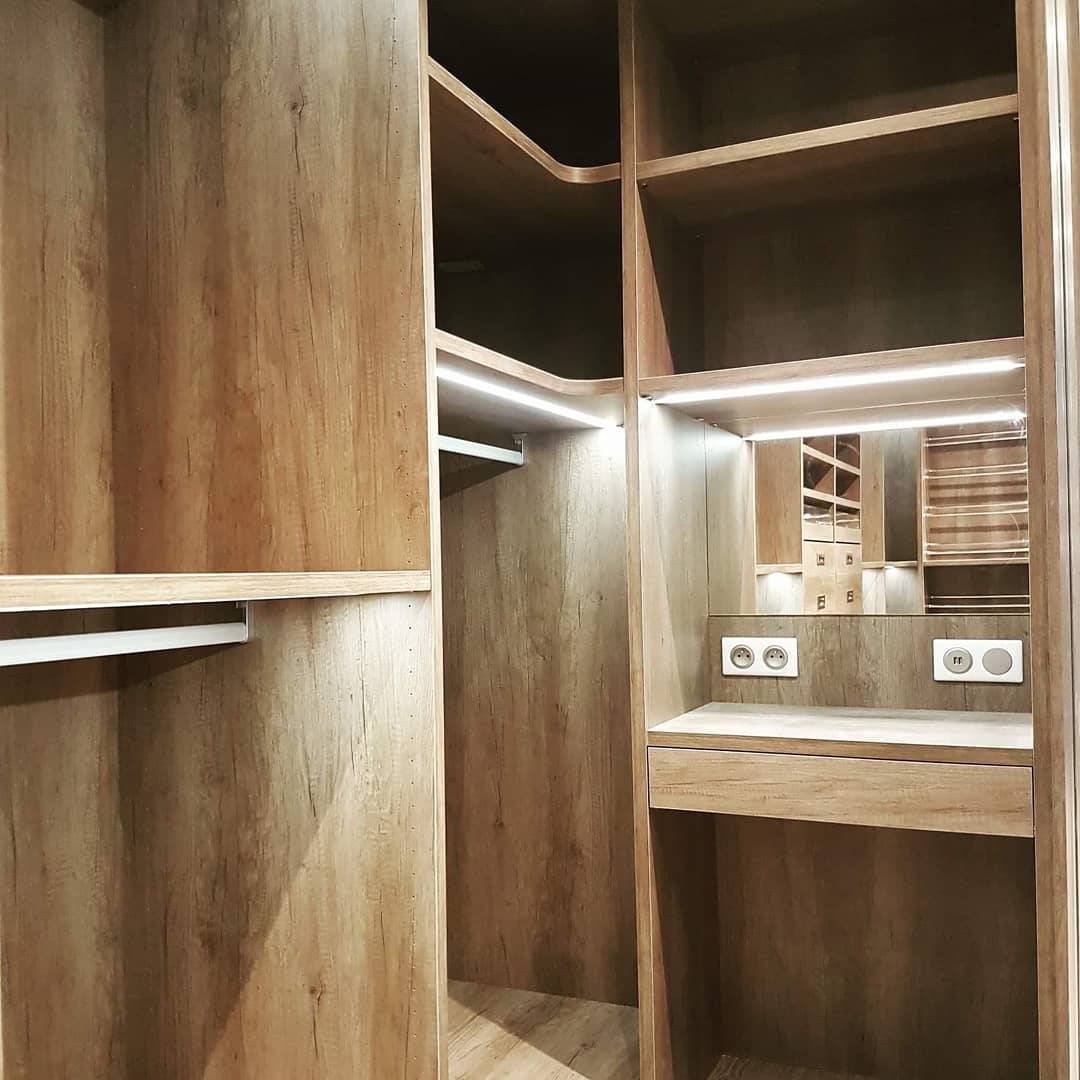 Ce dressing, à la fois chaleureux et moderne, est entièrement réalisé en 28 mm, incorporant une lumière intégrée en bandeaux LED encastrée dans l'épaisseur des étagères. Réalisé sur mesure à Pertuis, il présente un décor chêne Amilton avec une coiffeuse indépendante équipée d'un miroir intégré.