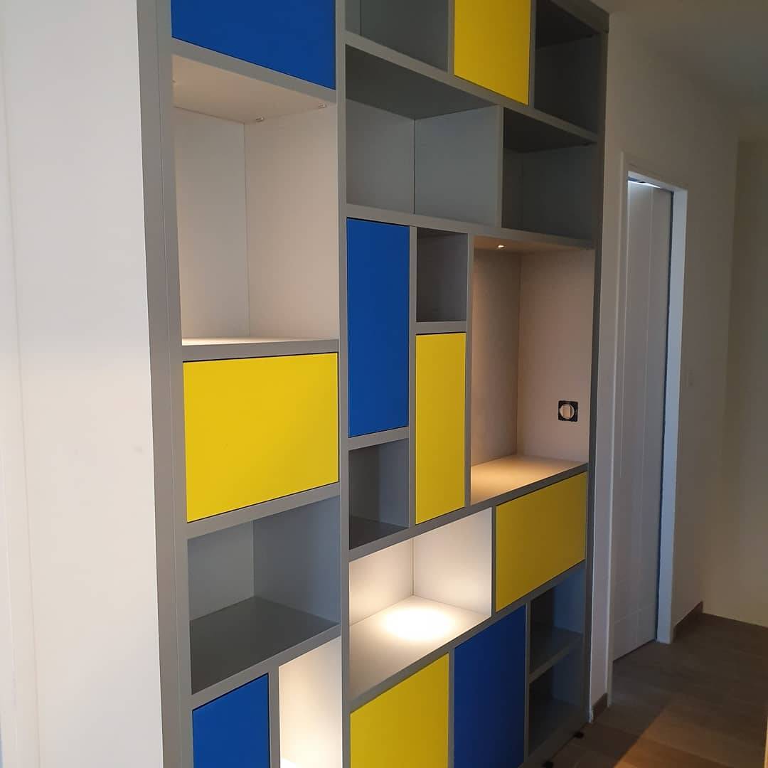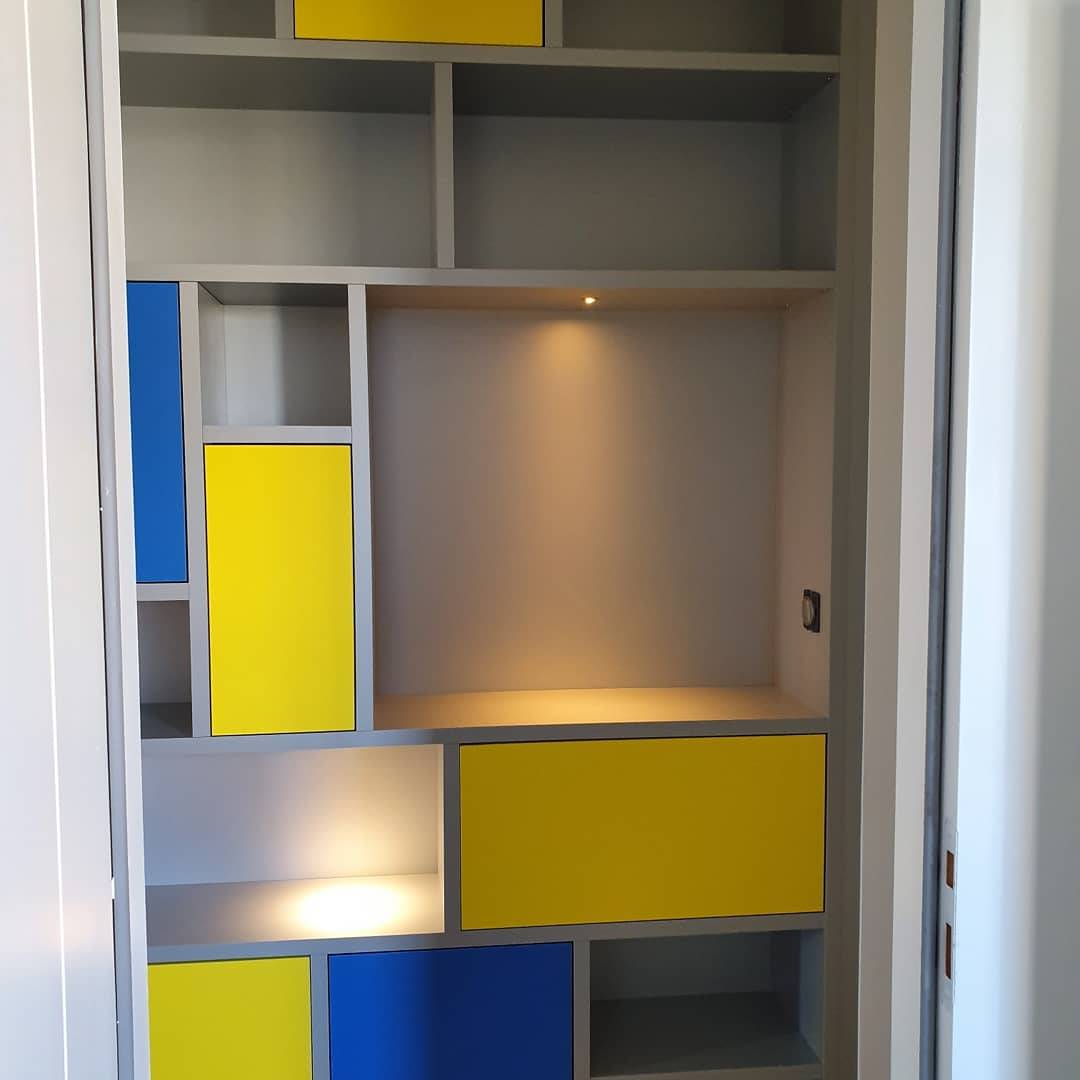 Cette bibliothèque sur mesure, conçue aux Milles (Aix-en-Provence), se distingue par son épaisseur de 28 mm et des portes bicolores en montage intérieur équipées du système de pouss-lach', offrant une esthétique vibrante avec des teintes jaune canari, bleu intense, et une structure en laiton.